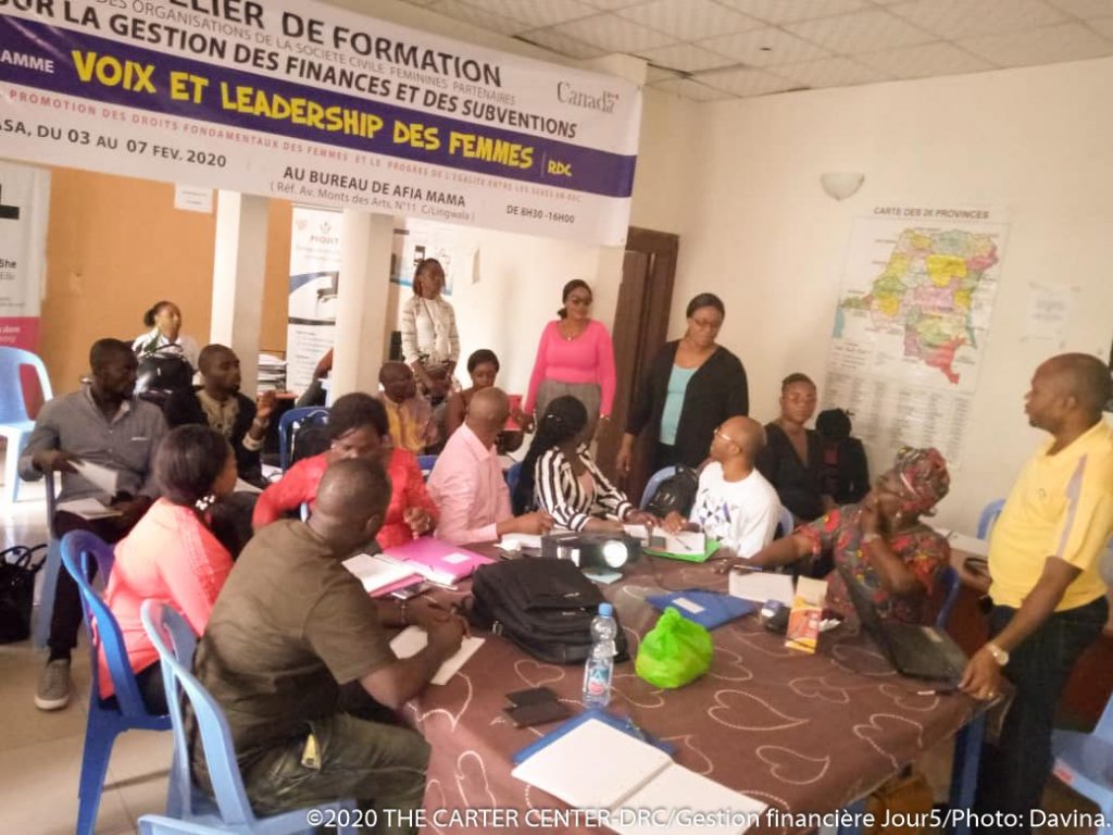 La Maison des Droits de l’Homme du Centre Carter à travers son programme Voix et Leadership des Femmes, a organisé du 03 au 07 Février 2020, une formation axée sur la gestion financière et de subventions, en faveur de 30 OSC féminines partenaires du programme Voix et Leadership des Femmes. La formation s’est tenue dans la salle de réunion de l’une des organisations partenaire du programme VLF, dénommé Afia Mama, située sur l’avenue Mont des arts dans la commune de la Gombe.
